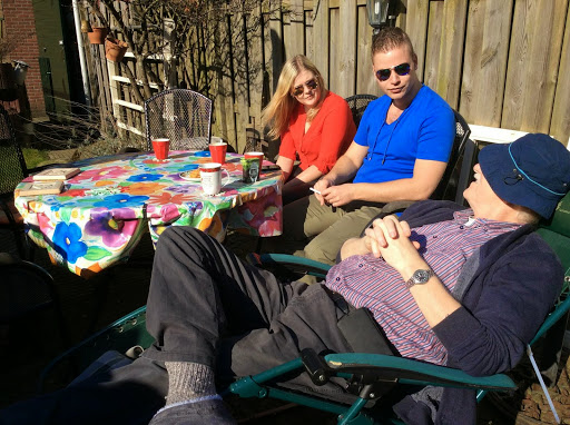 Lekker in het zonnetje koffiedrinken! — met Jaap van der Ploeg, Birgit Lanjouw en Jurre van der Ploeg.